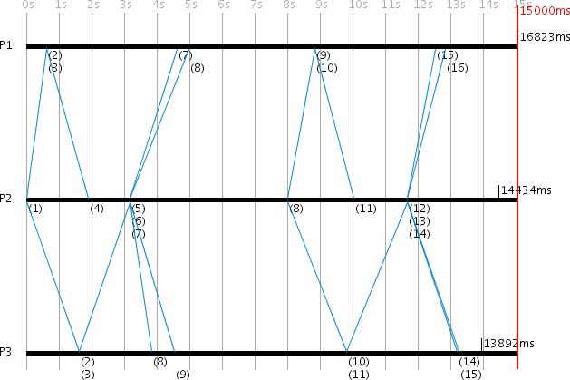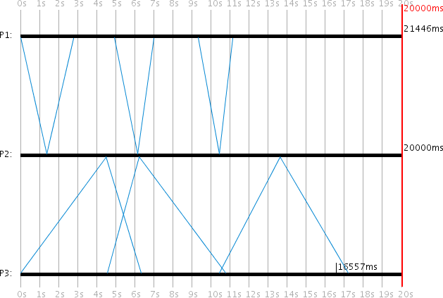 Because P3 starts a new request before receiving the answer to its previous one, and because it always associates server responses with its most recently sent request, its RTT calculations become incorrect on each round, and its local time is poorly synchronized. P1 synchronizes to 21446ms (error: -1446ms) while P3 only reaches 16557ms (error: -3443ms).